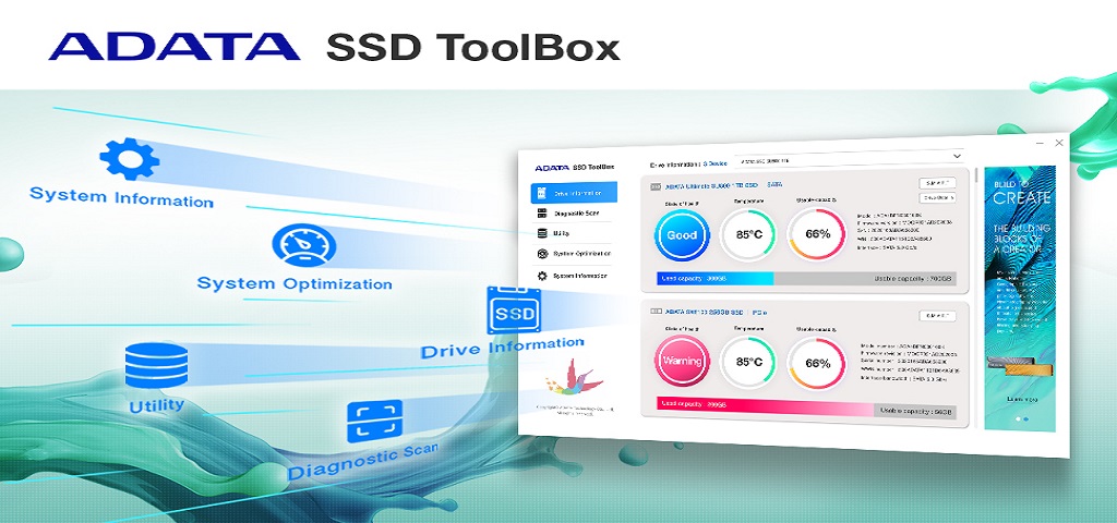 Satın alınan her SU650, ADATA SSD Toolbox and Migration Utility yazılımını ücretsiz olarak indirme hakkı kazandırır. SSD Toolbox, kullanıcıların, disk durumu, aşınma düzeyi ve ömür bilgileriyle SU650 diskini izlemelerine ve yönetmelerine olanak tanır. Migration Utility, kolay ve hızlı yedeklemeye ve işletim sistemi de dâhil olmak üzere tüm disklerin içeriklerinin taşınmasına yönelik tasarlandığından özellikle sabit diskten katı hâl diskine geçen kullanıcılar için yararlıdır.