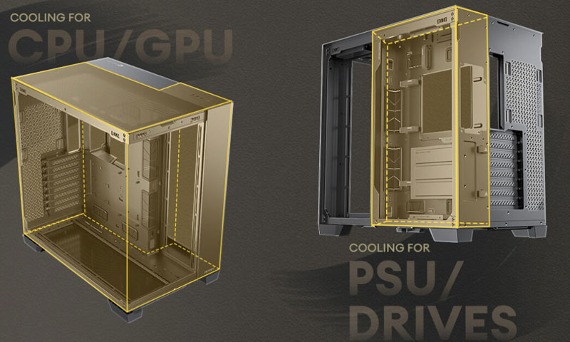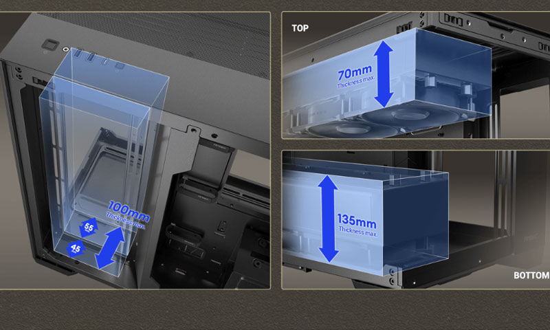 Üst, alt ve sağ bölümlerin tamamında kalın 360 mm radyatör desteği bulunur. Bu geniş iç hacim, olağanüstü soğutma kapasitesi ve yüksek verimlilik sunarak en zorlu sistem yapılandırmalarına uyum sağlar.