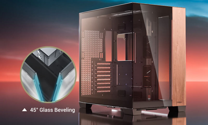 Ön ve sol cam panelde uygulanan özel 45° eğimli kenar teknolojisi, iki cam yüzey arasındaki geçişi neredeyse görünmez hale getirir. Ultra ince birleşim noktası sayesinde kesintisiz, panoramik ve yüksek şeffaflık sunan 270° görüş açısı elde edilir. Bu yapı, üst seviye PC bileşenlerinin ve aydınlatma efektlerinin eksiksiz şekilde sergilenmesini sağlar.