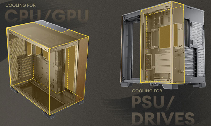 Sol bölümde CPU ve GPU, sağ bölümde ise PSU ve depolama birimleri yer alır. Bu bağımsız hava akışı yapısı, bileşenlerin birbirini etkilemeden daha verimli ve serin çalışmasına olanak tanır.