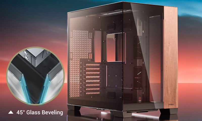 Ön ve yan cam panellerde kullanılan 45° özel pah (bevel) teknolojisi, camlar arasındaki sınırı ortadan kaldırarak kesintisiz ve ultra şeffaf bir görüş sunar. Ön panelin sağ tarafında yer alan doğal ahşap yüzey, kasayı yaşam alanınıza estetik bir şekilde entegre etmenizi sağlar ve premium bir görünüm kazandırır.