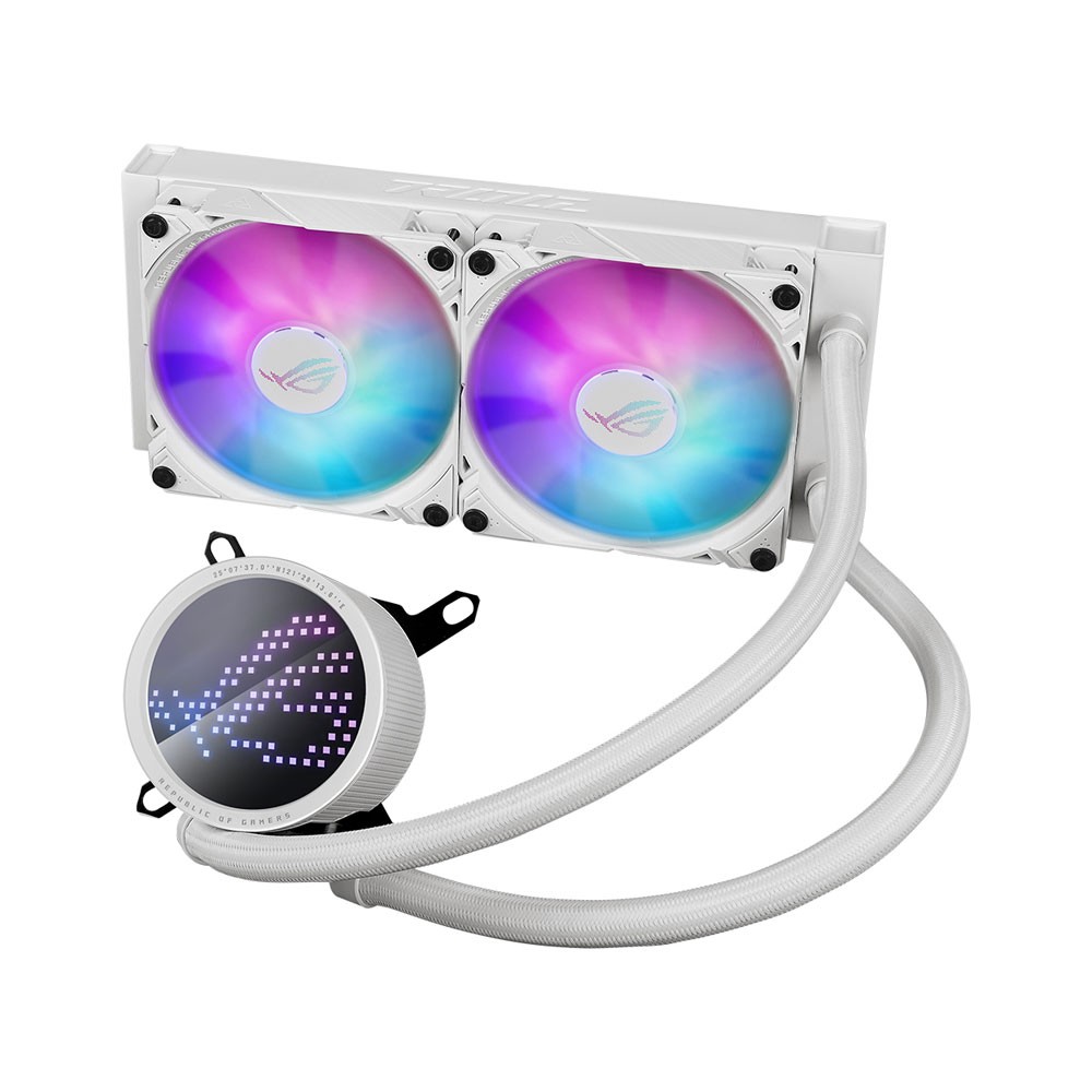 ROG Ryuo III 240 White Edition hepsi bir arada sıvı CPU soğutucusu, Asetek 8.nesil sıvı pompası çözümü, Anime Matrix™ LED Ekran ve ROG ARGB soğutma fanları