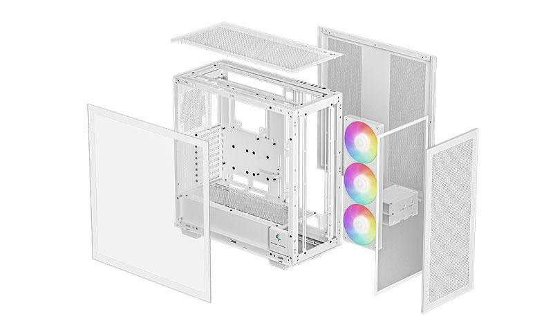 DEEPCOOL MORPHEUS WH kasasını çevreleyen yüksek hava akışı panelleri, ön, sağ, üst, alt, arka ve hatta PSU örtüsünün üst kısmında bile bulunuyor; güçlü ısı üreten bileşenler için mükemmel hava akışı sağlanır. Ön, üst ve alt panellerdeki yüksek akış mesh filtreleri, tozları engellemek için dahildir.
