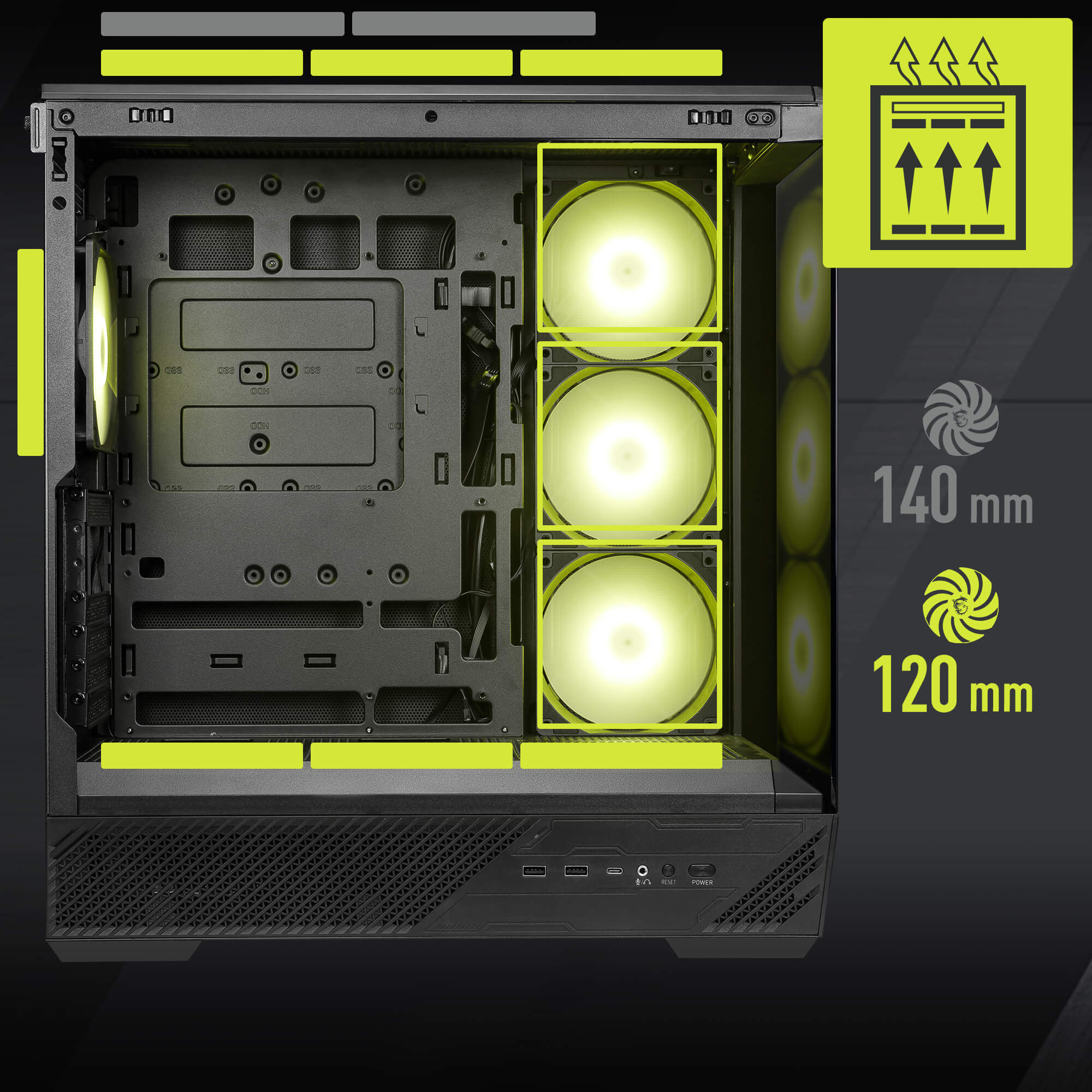 - Üst: 3 x 120 mm / 2 x 140 mm