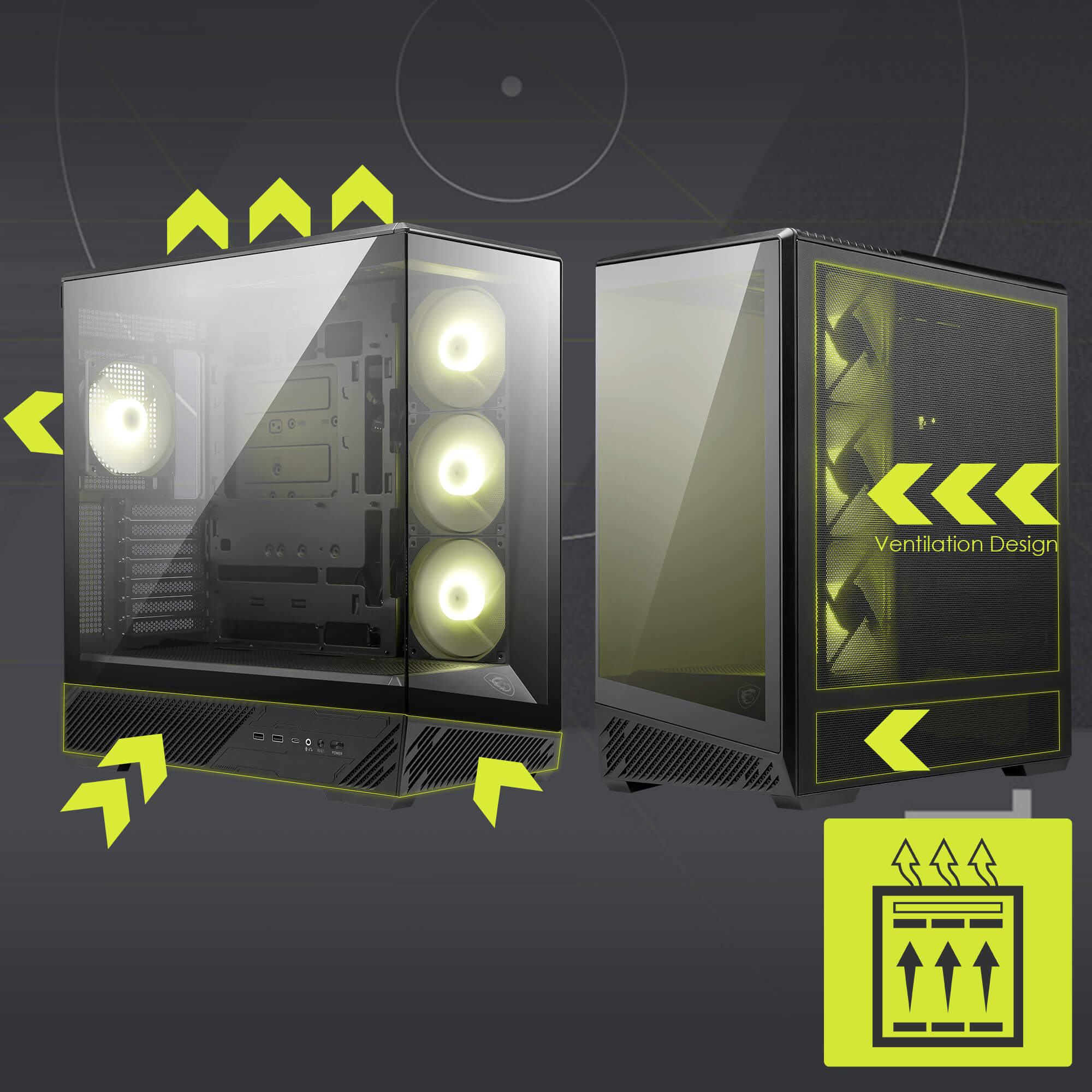 Kasanın yanlarında ve ön kısımında sayısı arttırılan havalandırma boşlukları genel ısı giderimini arttırır. 10 adede kadar fan kulllanmaya olanak tanıyan bu tasarım yanlarda 3 adet ters kanatlı, arka kısımda ise bir normal fan ile gelir.