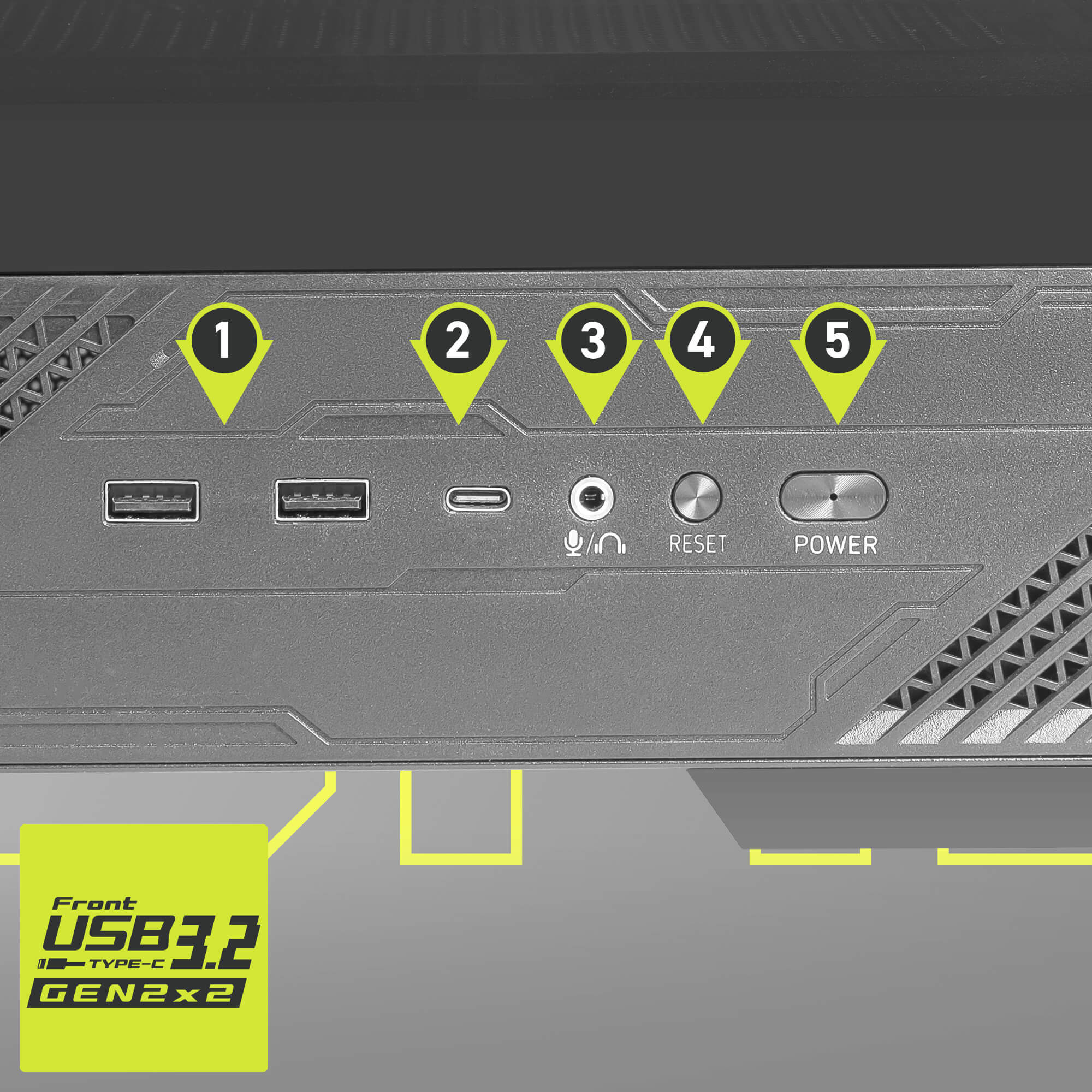 Yan G/Ç paneli üzerinde, yüksek hızlı veri aktarımı için uyumlu anakartlara köprüleyebileceğiniz bir adet USB 20Gbps Type-C portu bulunur.
