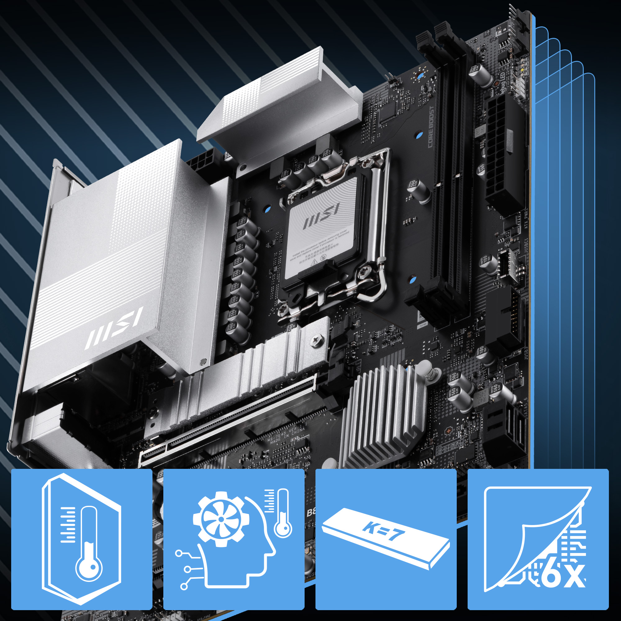 Frozr Guard: Genişletilmiş Heatsink tasarımı, 7W/mK MOSFET termal yastıkları, şok bobinleri için ekstra termal yastıklar ve EZ M.2 Shield Frozr II ile gelişmiş ısı giderimi.